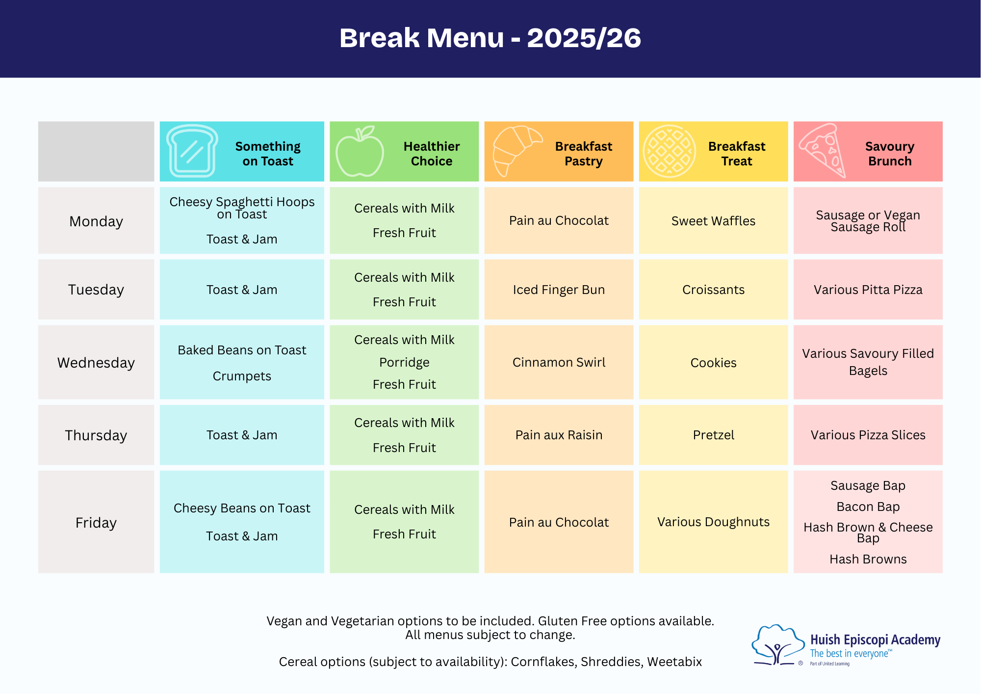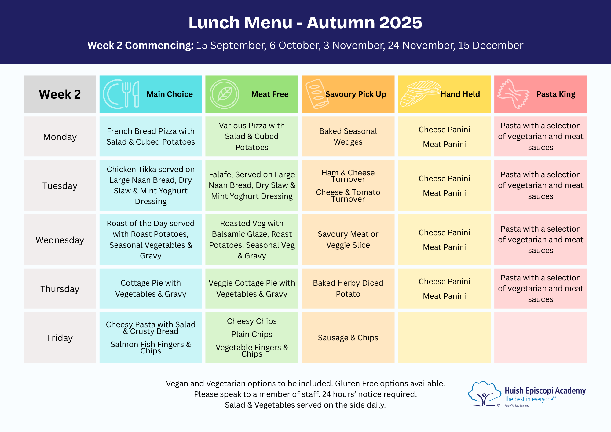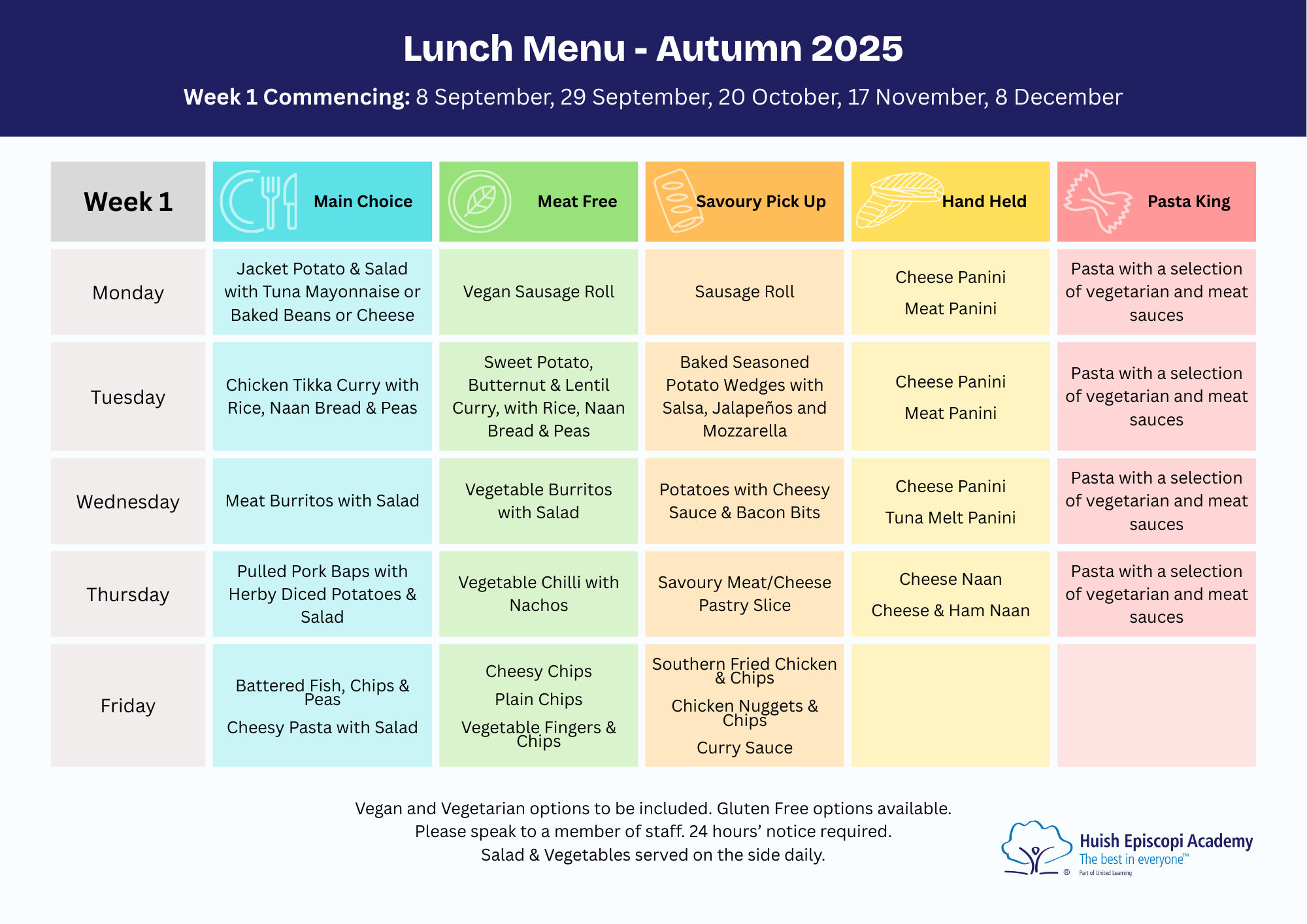 Please ensure that your child has money on their cashless catering account to cover items ordered. Cashless catering accounts can be topped up on ParentPay. If you require login details for ParentPay please contact HuishAccounts@hea.ac.uk