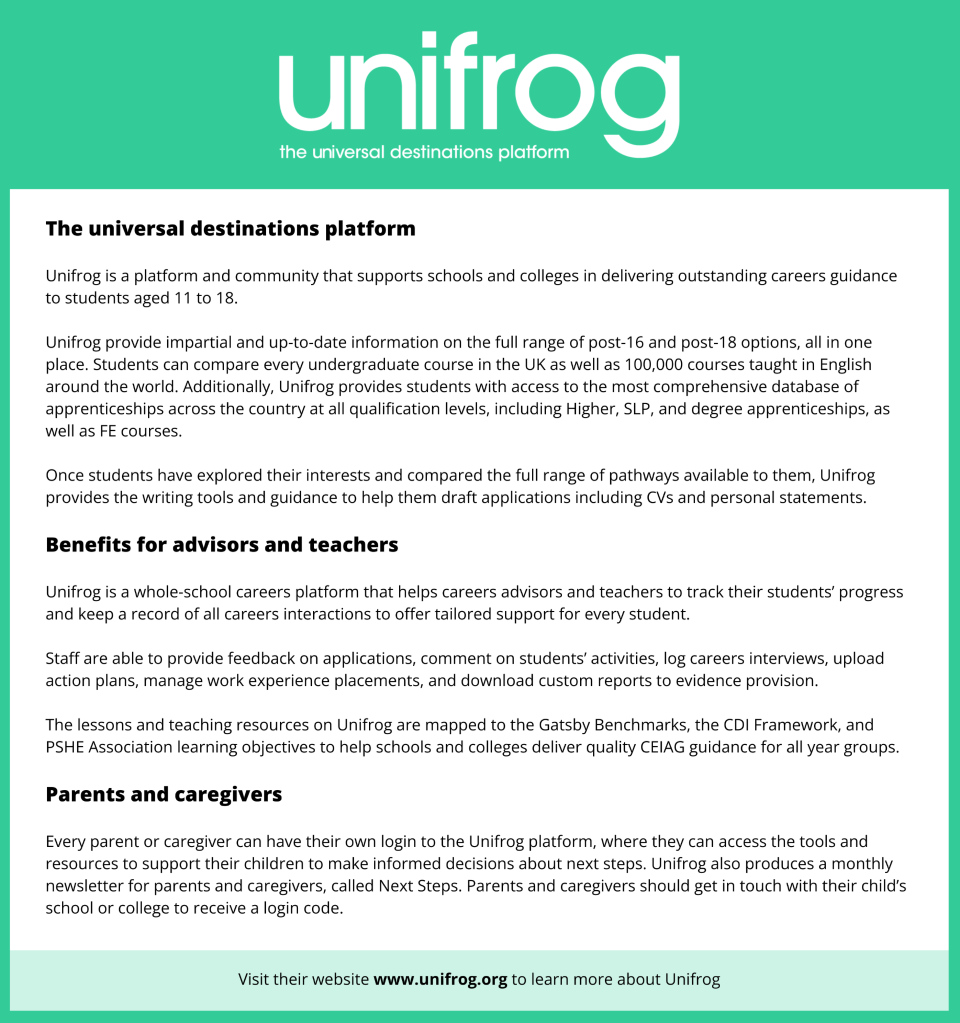 In keeping with our commitment to provide students with outstanding careers guidance and tailored support when choosing their next step after school, we are using Unifrog; an award-winning, online careers platform. All students have access to this website.